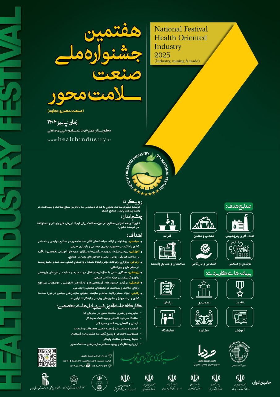 احتراماً به استحضار میرساند "هفتمین جشنواره ملی صنعت سلامتمحور" در راستای اجرای سند راهبردی ارتقای سلامت کشور و با هدف ترویج فرهنگ سلامتمحوری در سیاستها و فعالیتهای سازمانی، با مشارکت سازمانهای متولی سلامت در ادوار جشنواره، از جمله وزارت بهداشت، درمان و آموزش پزشکی، وزارت صنعت، معدن و تجارت، سازمان ملی استاندارد، سازمان حفاظت محیط زیست و مجامع علمی و تخصصی در آذرماه ۱۴۰۴ با حضور مسئولین و مقامات عالی کشور، برگزار خواهد شد.